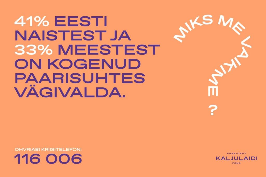 However, life is much more colorful and often has dark shades – did you know that 41% of women and 33% of men in Estonia have experienced abuse in a close relationship at least once in their lives? The media often portrays the topic of domestic abuse as concerning a narrow segment of society and rather cases of physical violence. Unfortunately, domestic abuse has several forms (mental, physical, sexual, economic, cyber/digital), it occurs largely hidden and does not “ask” about gender, age or health status.