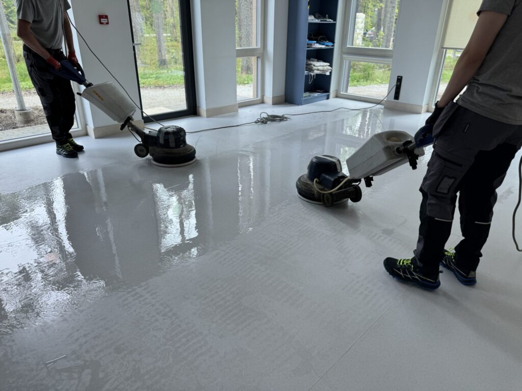 Et tagada taastatud pinna pikaajaline vastupidavus ja lihtsam hooldus edaspidi, viimistleti põrand lõpuks HS poleerimismasina ja polüesterketta abil kuivtöötlusega. See protsess sulges põrandakatte poorid, takistades mustuse edasist kogunemist ja pikendades oluliselt pinna hooldusjärgset seisukorda.